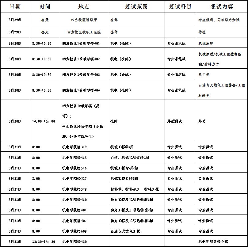 说明: 3月29日报到时,请在报到处--pg电子官方网站举牌位置填写报到登记详情表;3月30日专业课考试科目《机械原理》的考生请自带绘图工具;3月31日专业面试分组名单详见当天pg电子官方网站楼一楼张贴,各复试专业按照公布名单的顺序依次进行,政审表在面试时请交于各组政审老师;529房间为考生面试候场处。