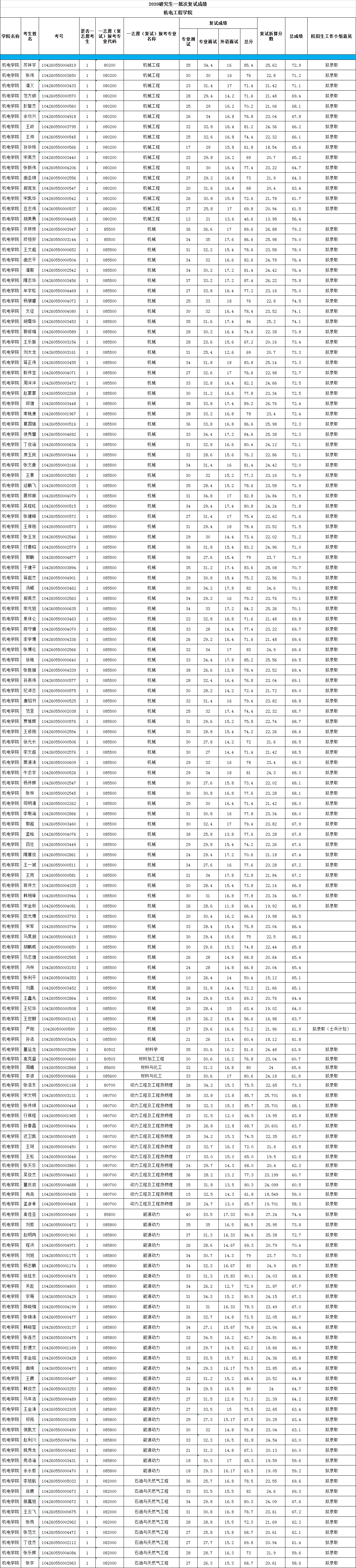 2020年pg电子官方网站研究生一批次复试成绩