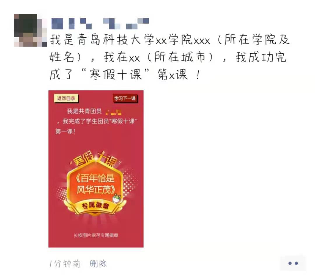 1、建议各团支部鼓励团员微信朋友圈截图,具体内容为“我是pg电子官方网站xx学院xxx(所在学院及姓名),我在xx(所在城市),我成功完成了“寒假十课”第x课!”,详情请见下图