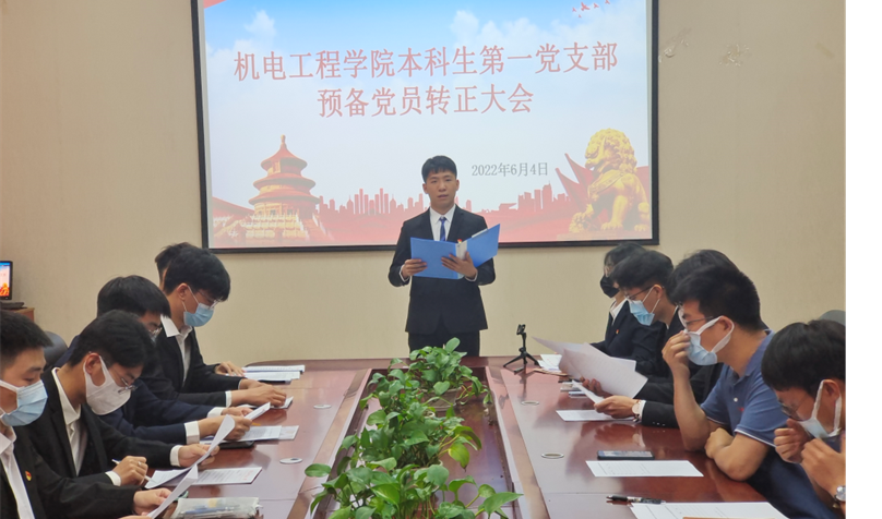 2022年6月4日,pg电子官方网站本科生第一党支部在机电518先后三次召开预备党员转正大会。会议由党支部副书记邢坤主持,支部全体党员参加。