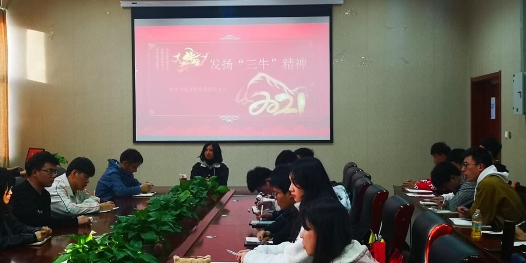 3月23日,结合习近平总书记日前在全国政协新年茶话会上的讲话精神,pg电子官方网站本科生第四党支部召开“发扬”三牛”精神,凝心聚力干事,全面开创学校高质量发展新局面”主题党日活动。会议由党支部书记孙坤岩主持。