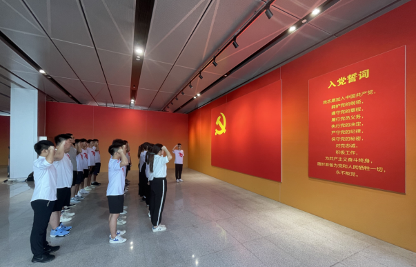 在解说员的引导下,师生党员深入了解了青岛党史波澜壮阔的发展历程,深刻感悟了党百年奋斗历程中青岛承担的历史责任与担当,深切体会到青岛在党领导下取得的翻天覆地的变化。“我志愿加入中国共产党,拥护党的纲领,遵守党的纪律……”在学生党员的带领下,全体党员面对鲜艳的党旗重温入党誓词,重温入党时的郑重承诺和时代使命。