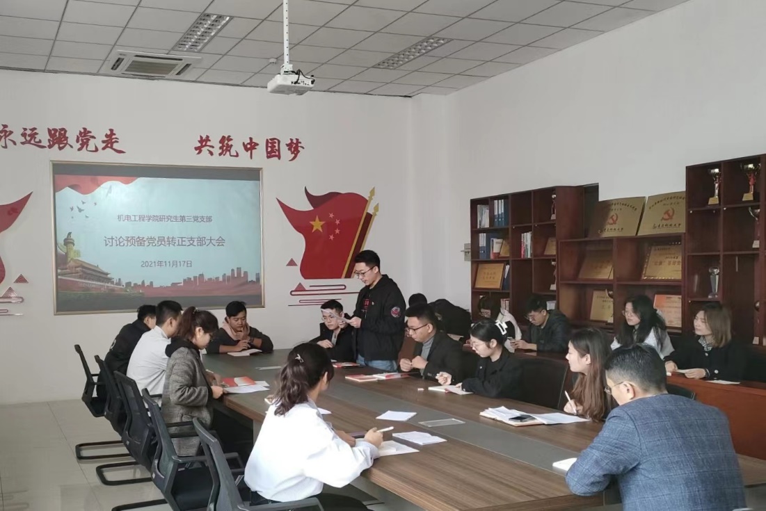 11月17日上午,pg电子官方网站研究生第三党支部在机电楼529会议室召开预备党员转正大会,支部党员除一人请假外其他人员参加会议,会议由宗萌主持。