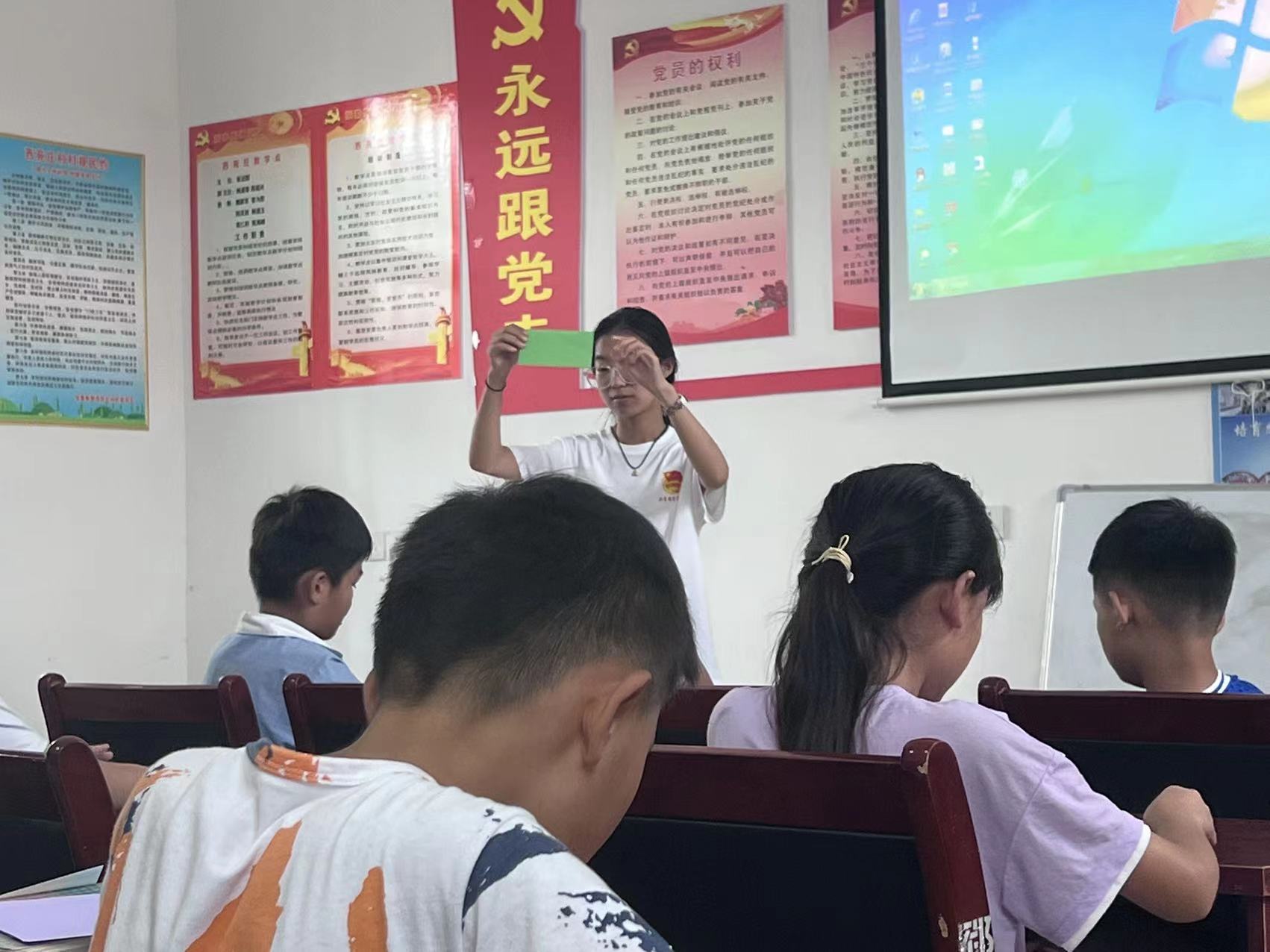 活动中,志愿者们用心传授科学文化知识,围绕双语教学、绘画折纸、歌唱红色歌曲、课业辅导、防溺水安全教育等内容开设了丰富有趣的实践小课堂,他们耐心辅导22名留守在家的孩子们完成暑假作业,及时解答大家的困惑,有针对性的给予帮助。通过发挥专业特长带领孩子们开展“成长五部曲”主题心理团辅活动,在趣味游戏中,大家“大手”拉“小手”,让大学生与小学生成功“搭桥”。