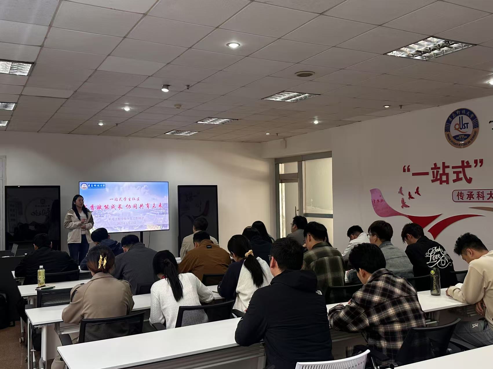 4月23日,pg电子官方网站在崂山校区“一站式”学生社区服务大厅学业发展中心组织开展“书香赋能成长、协同共育未来”学生工作推进会。全体专兼职辅导员、学生组织代表、党员代表参加会议,会议由辅导员崔瑛主持。