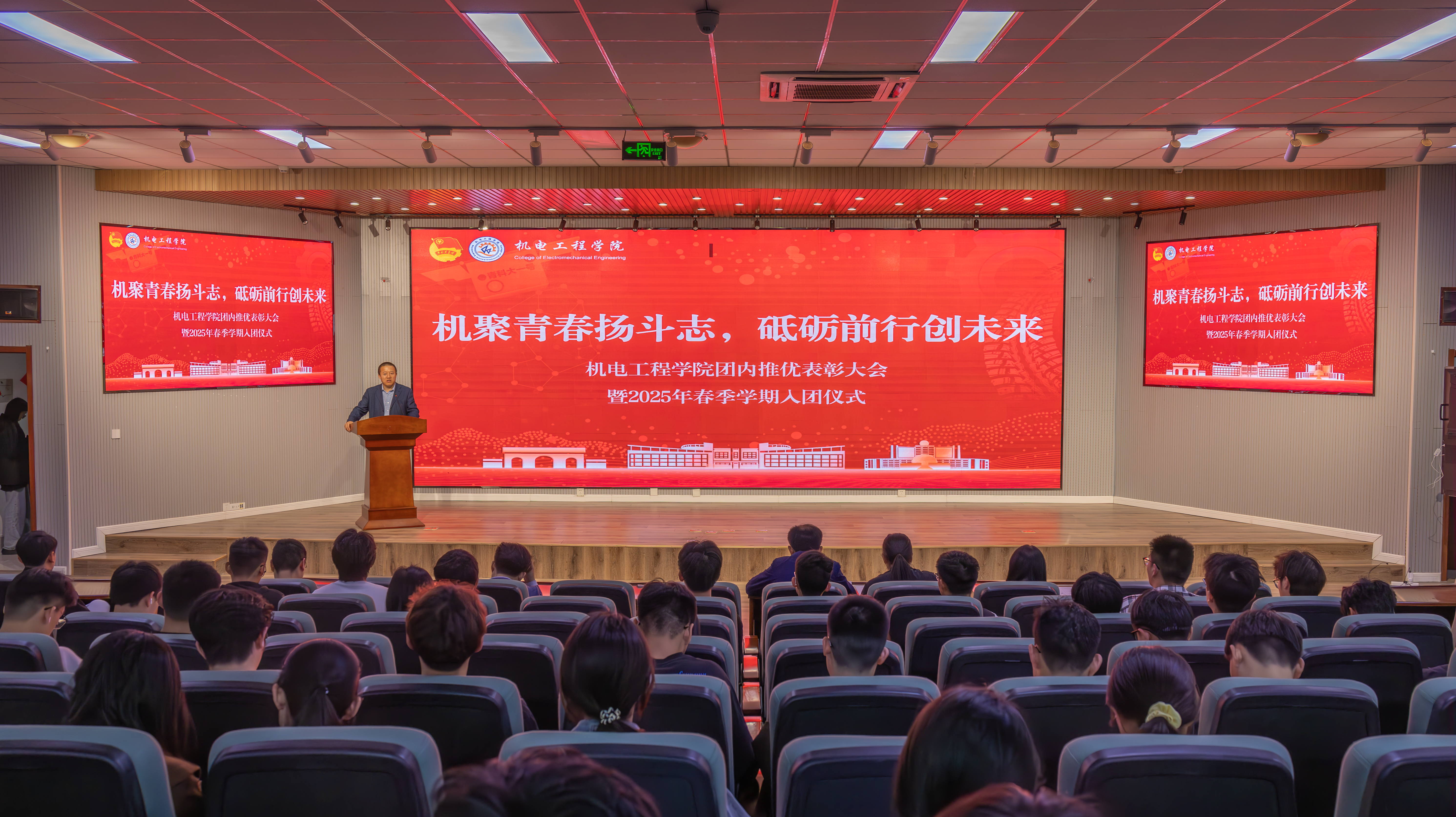 大会在庄严的国歌声中拉开帷幕。杨小明为活动致辞,他强调:“青年是国家的未来,要牢记习近平总书记的嘱托,以党的创新理论武装头脑,将个人成长融入国家发展大局,在奋斗中锤炼本领、增长才干。”杨小明鼓励共青团员要起好带头模范作用,从身边的小事做起,担当团员应有的责任。活动对团内推优先进集体及个人进行表彰,团委副书记于超宣读获奖名单,获奖代表依次上台领奖。随后,团委副书记李慧敏宣读2025年春季新发展团员名单,并为新发展团员代表颁发团章、团徽。在优秀团员代表的领誓下,全体与会人员面向团旗庄严宣誓,铿锵誓言彰显青春担当,团歌奏响传递使命力量。