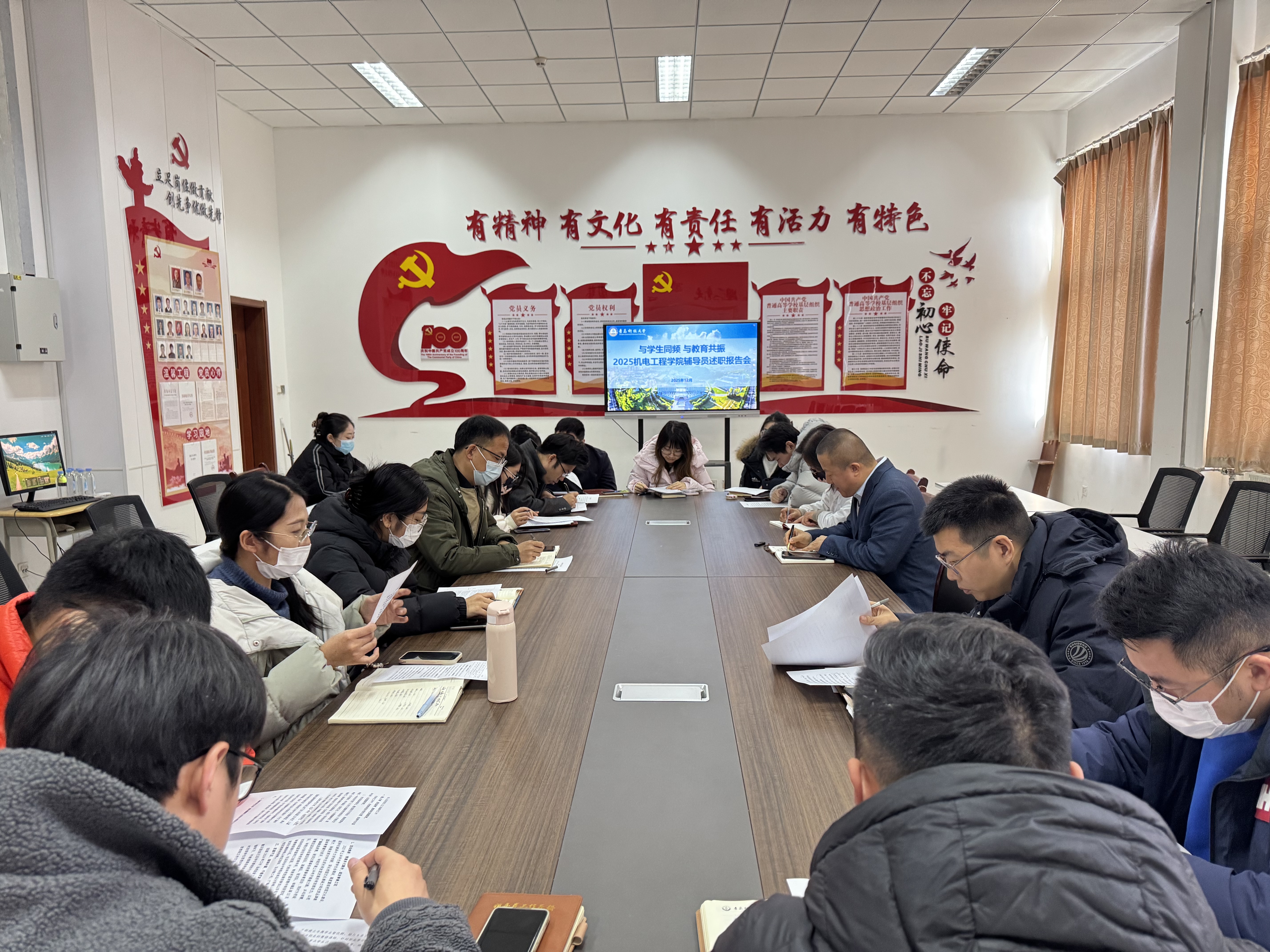 12月16日,pg电子官方网站在机电楼党建活动室组织2025年度专职辅导员述职报告会。学院党委副书记杨小明参加会议并讲话,副院长张卫锋、教师代表白杨、校党委宣传部理论教育科正科级干事王乐昌受邀参会,全体专兼职辅导员参加会议并依次述职。