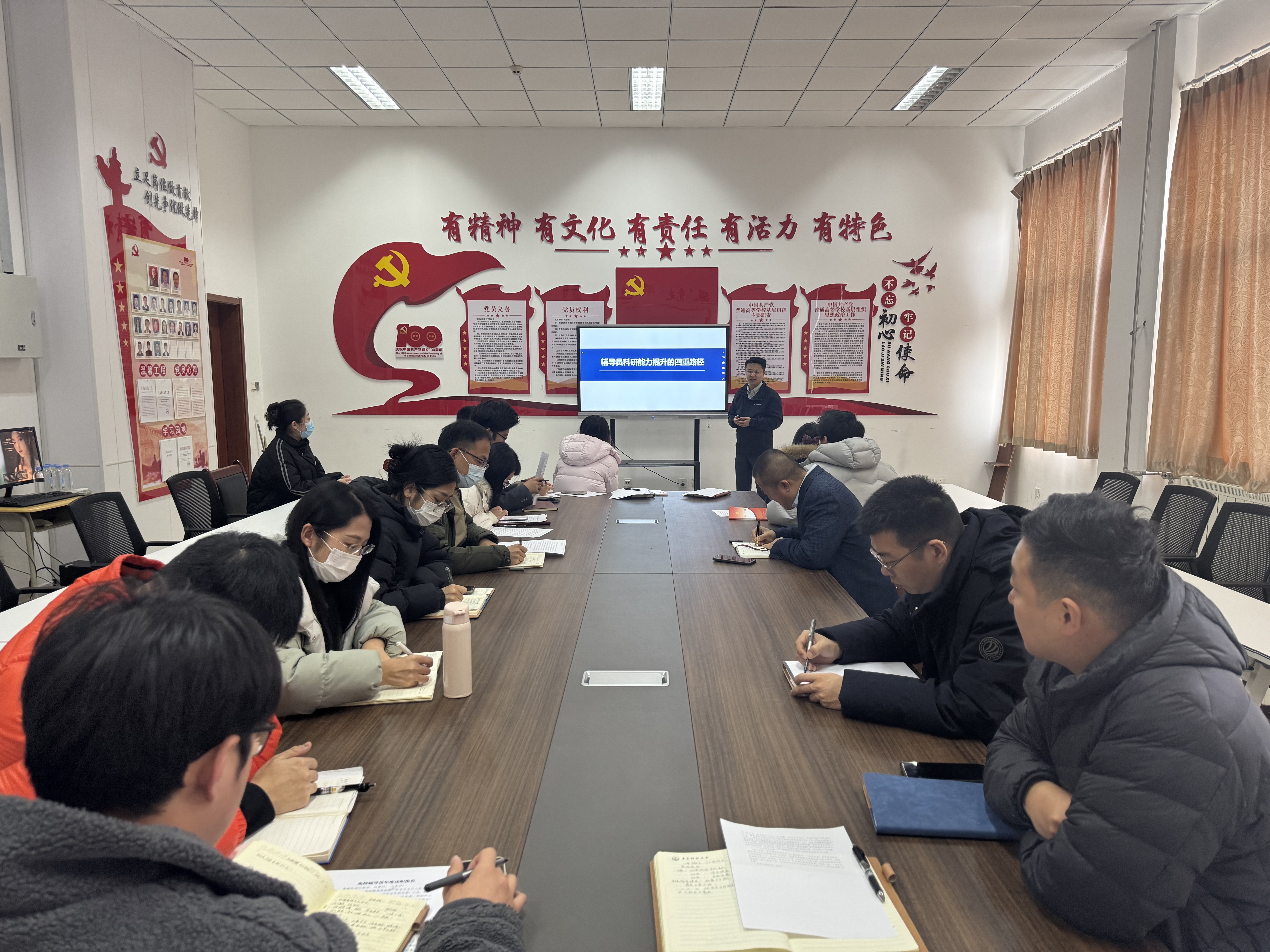王乐昌作为学院辅导员第十一次自主培训的特邀嘉宾,为全体辅导员作“辅导员科研能力提升的四重路径”专题报告。王乐昌首先讲解了当前辅导员开展工作研究、理论探讨和路径探索的背景和契机,围绕辅导员职业发展与工作实效提升,从四个维度展开深入阐述:一是立足工作实践、开展理论研究。强调要以日常学生管理、思想教育中的真实案例为基础,提炼工作规律,将实践经验转化为理论成果。二是坚持问题导向、进行学术提升。提出要聚焦学生工作中的难点问题,以问题破解为切入点开展专题研究,实现“以研促干”。三是加强理论学习、厚实理论功底。建议通过系统学习经典原著、高质量论文等相关理论知识,把握理论前沿,构建完善的知识体系。四是把握科研规律、遵循学术规范。从论文写作、课题申报、成果发表等环节,讲解科研工作的基本流程与规范要求,为辅导员科研能力提升提供具体指引。报告内容紧密结合辅导员工作实际,聚焦大问题、真问题、新问题,顶天立地,具有极强的针对性与指导性,引发在场辅导员的热烈讨论。