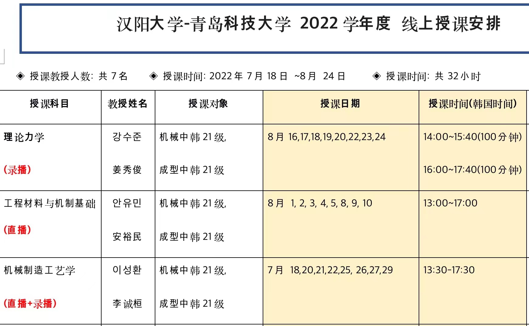 2022年暑假期间,汉阳大学7名教授对机械中韩和成型中韩两个合作办学专业级进行了共32小时的线上授课。授课科目为理论力学、工程材料与机制基础、机械制造工艺学、材料力学、流体力学等。授课方式有直播、录播、直播+录播三种。